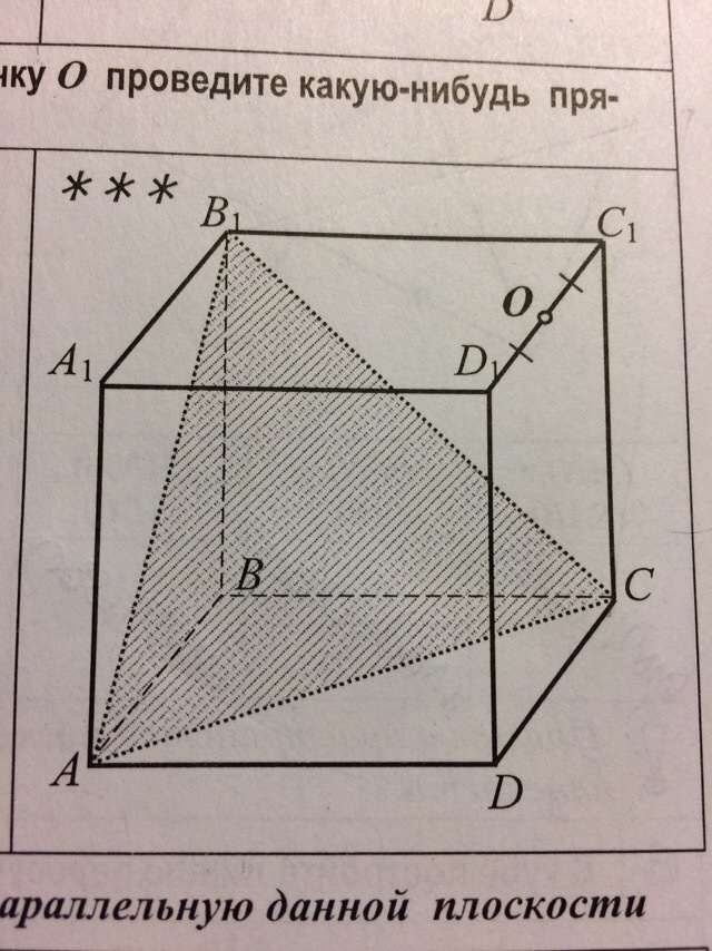 Дан прямоугольный параллелепипед ABCDA1B1C1D1. Через точку О проведите какую-нибудь прямую, параллельную плоскости, покаазанной штриховкой.