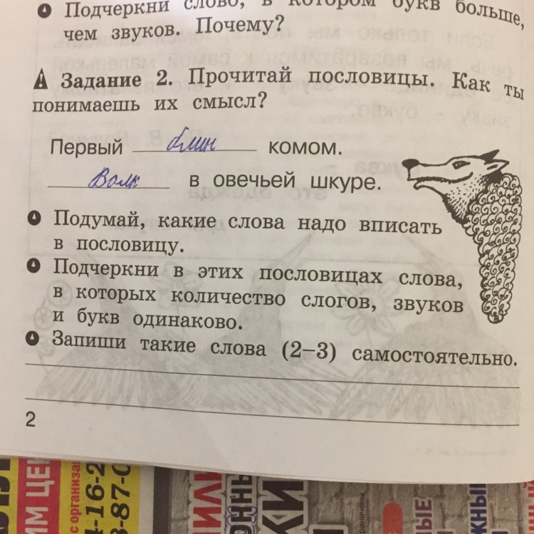 Первый и овечьей, блин и волк (в этих словах, одинаково количество звуков и букв).