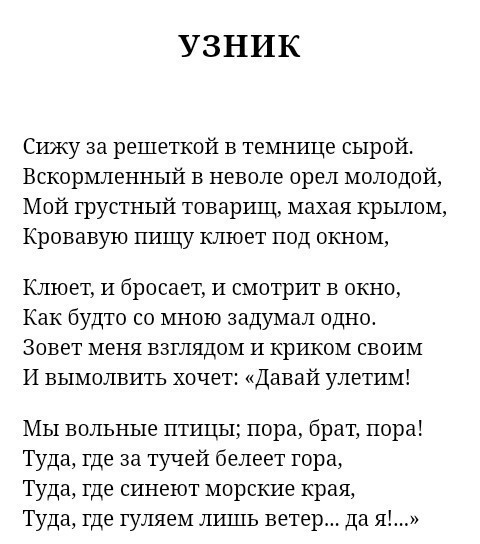 Узник сидит в темнице за решеткой, орел клюет выданную ему пищу под окном темницы, но орел тоже не свободен: вскормлен в неволе.