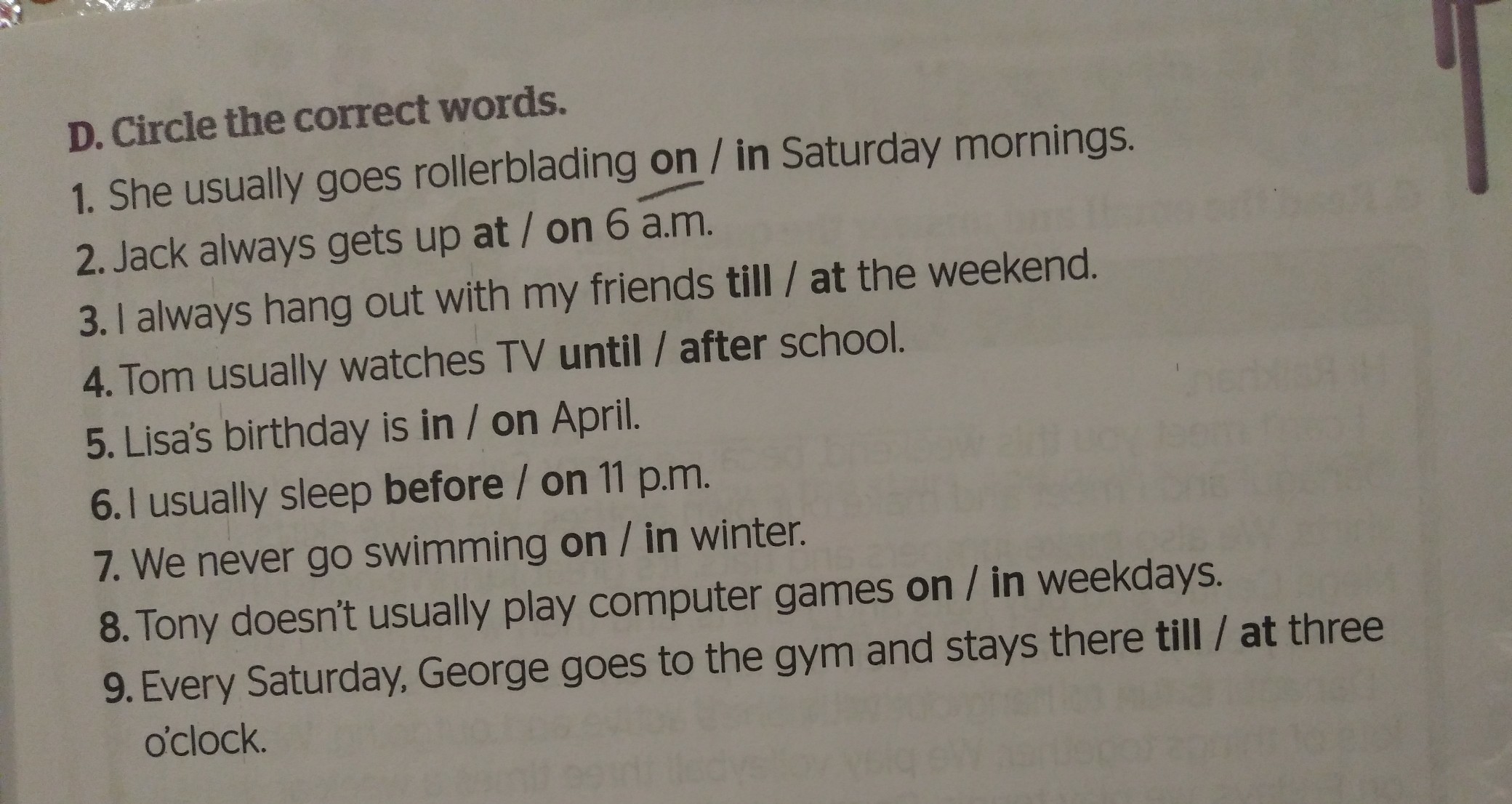 1on , 2at , 3 at ,4 after,5 on,6 before ,7 in ,8 on ,9 at