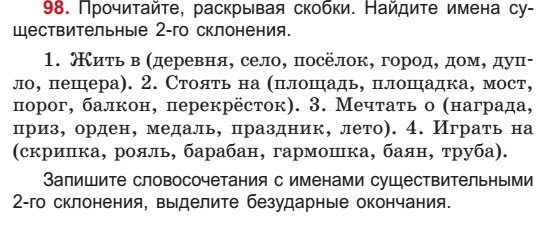 Жить в деревне, в селе, в посёлке, в городе, в доме, в дупло, в пещере. Стоять на площади, на площадке, на мосту, на пороге, на балконе, на перекрёстке. Мечтать о награде, о призе, о ордене, о медали, о празднике, о лете. Играть на скрипке, на рояле, на барабане, на гармошке, на баяне, на трубе.