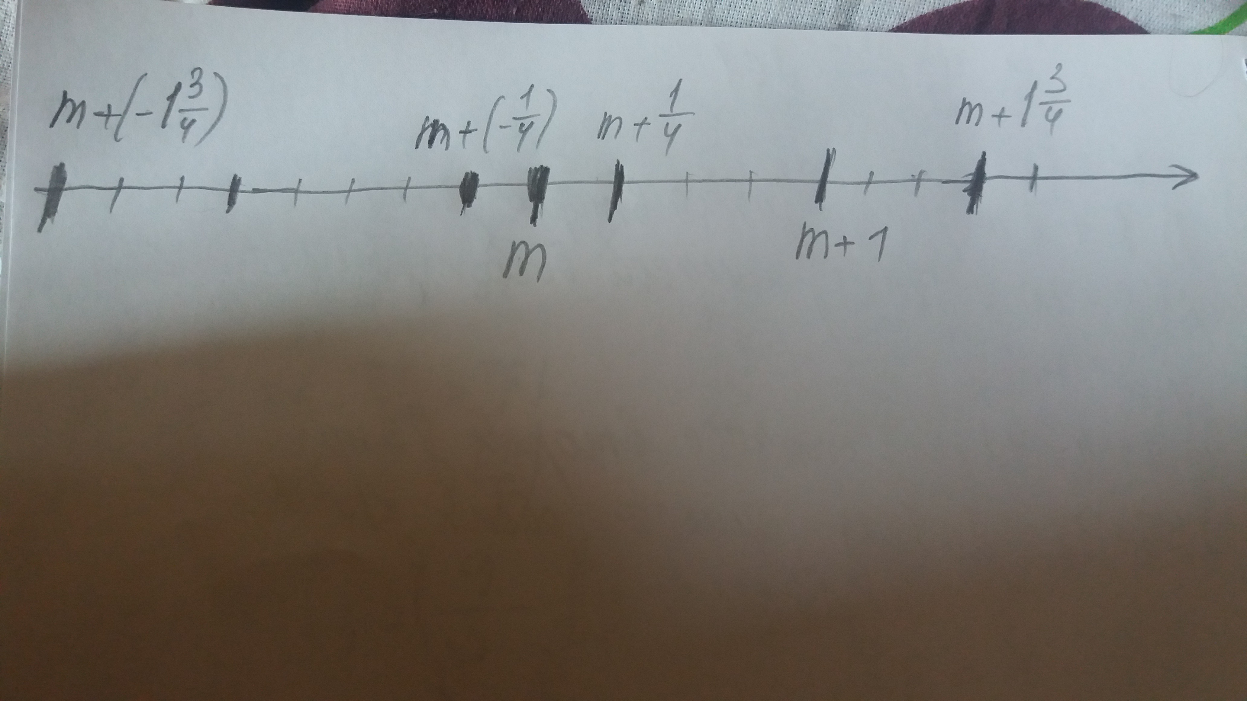 На прямой отмечены два натуральных чисел. Одна из них обозначено буквой m. Другое число следует за числом m, поэтаму оно равно значению выражения m+1. Отметьте на этой прямой число 1)m+1/4;2)m+(-1/4);3)m+1 целое 3/4;4)m+(-1целое3/4). Помогите мне если если не мложно то сфотографируйте ответ ❤️