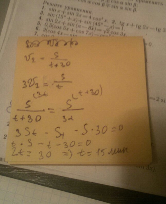 Из-за ремонтных работ на путях поезд проходит некоторое расстояние со средней скоростью v 2 , составляющей треть от обычной на этом участке скорости v 1 , при этом время движения возрастает на мин t = 30 мин . Определить, за какое время t 1 поезд обычно (по расписанию) проходит это расстояние? Ответ выразить в мин мин , округлив до целых