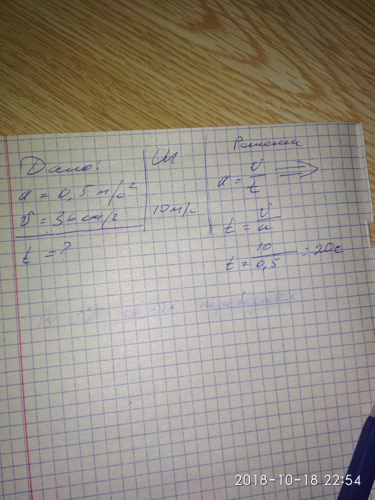 Товарный поезд, трогая с места двигался с ускорением 0,5 м/с^2, и разогнался до скорости 36 км/ч. За какое время это произошло.