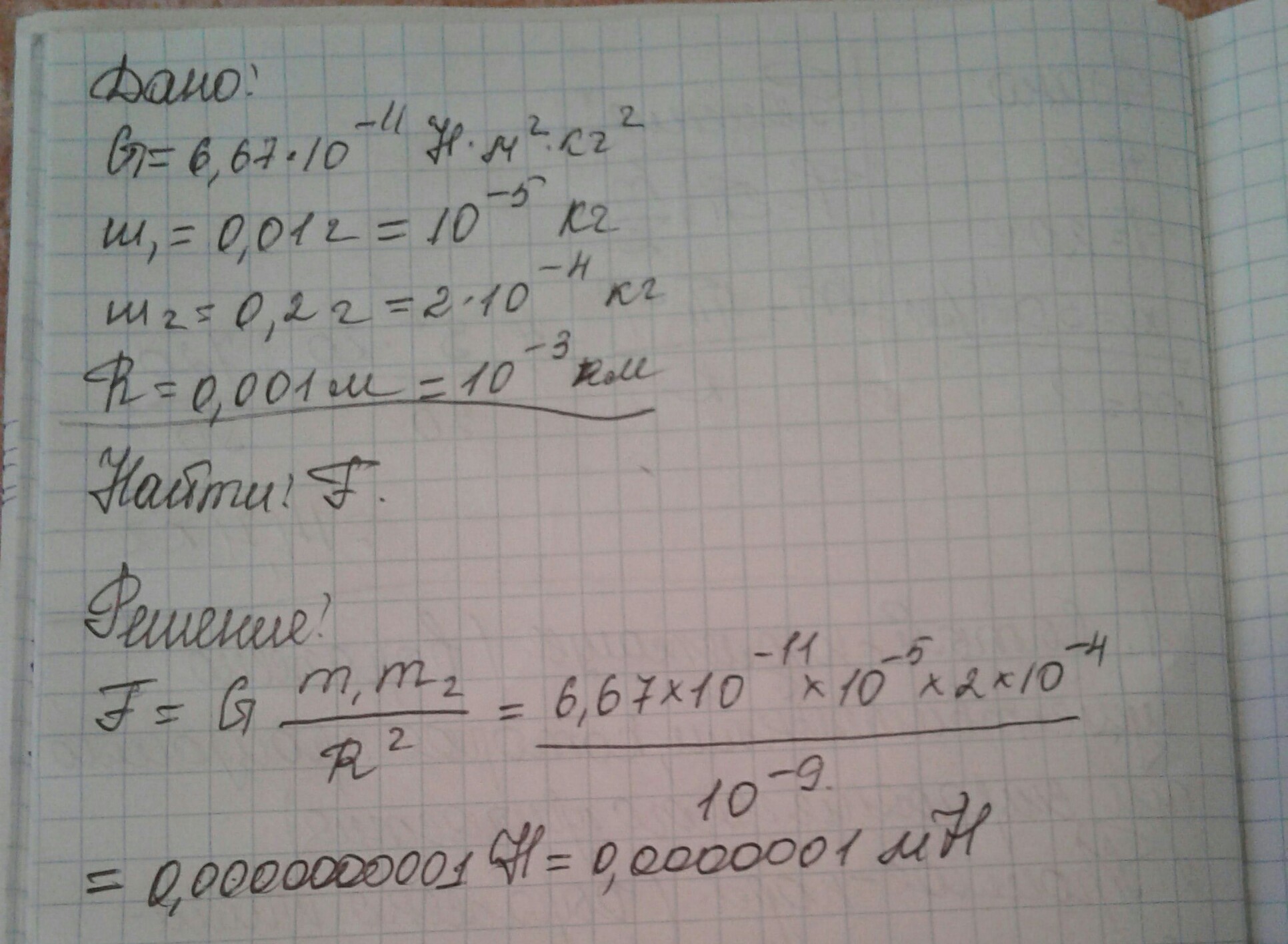 найдите силу которой тело массой 0.01 г и 0.2 г притягивают я друг к другу если расстояние между ними 0.001 м