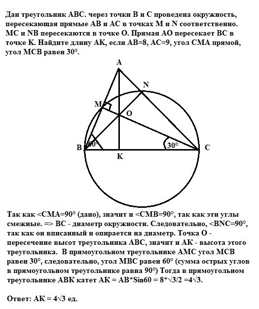 Так как <CMA=90° (дано), значит и <CMB=90°, так как эти углы смежные. => ВС - диаметр окружности. Следовательно, <BNC=90°, так как он вписанный и опирается на диаметр. Точка О - пересечение высот треугольника АВС, значит и АК - высота этого треугольника. В прямоугольном треугольнике АМС угол МСВ равен 30°, следовательно, угол МВС равен 60° (сумма острых углов в прямоугольном треугольнике равна 90°) Тогда в прямоугольном треугольнике АВК катет АК = АВ*Sin60 = 8*√3/2 =4√3.