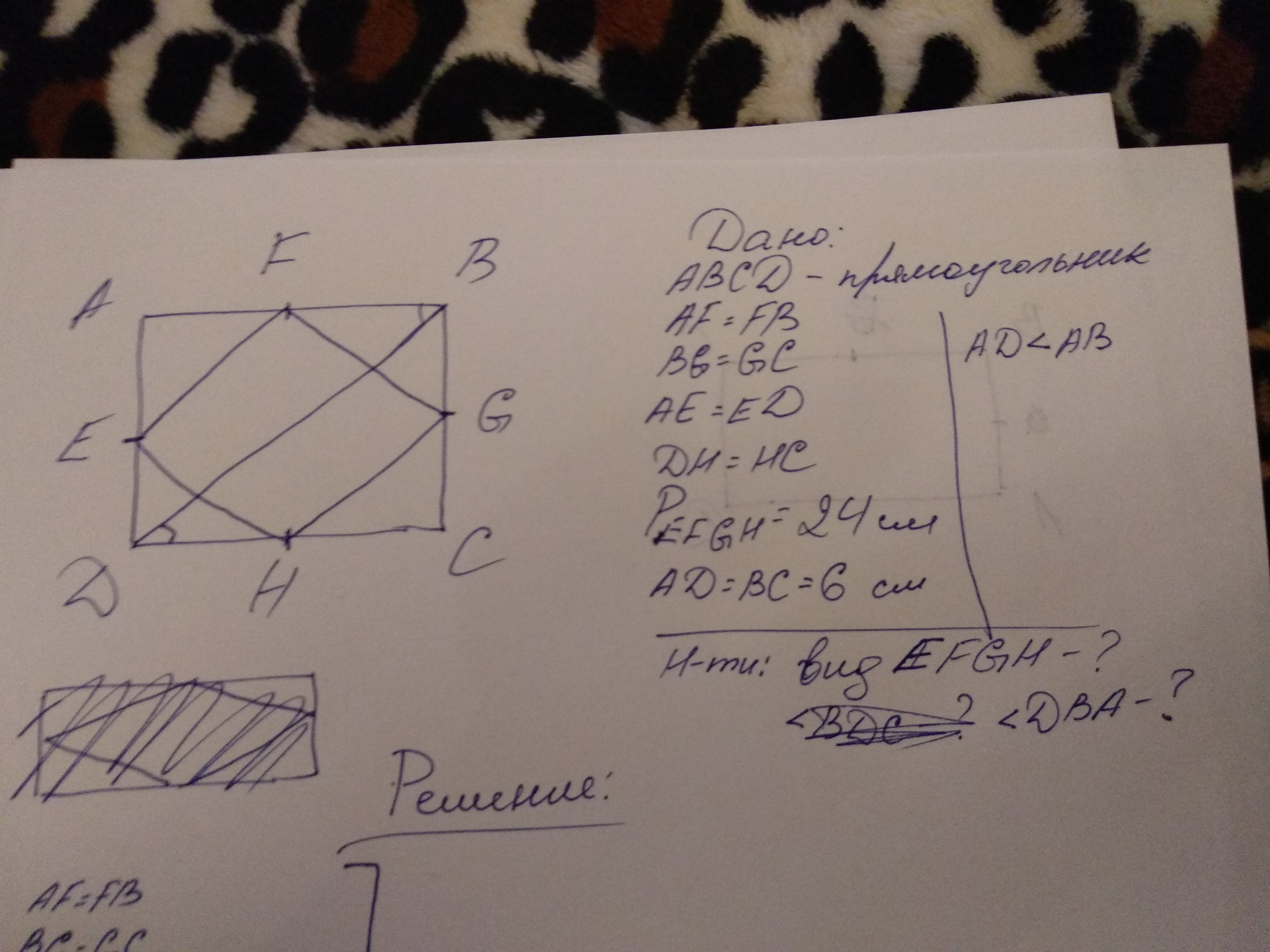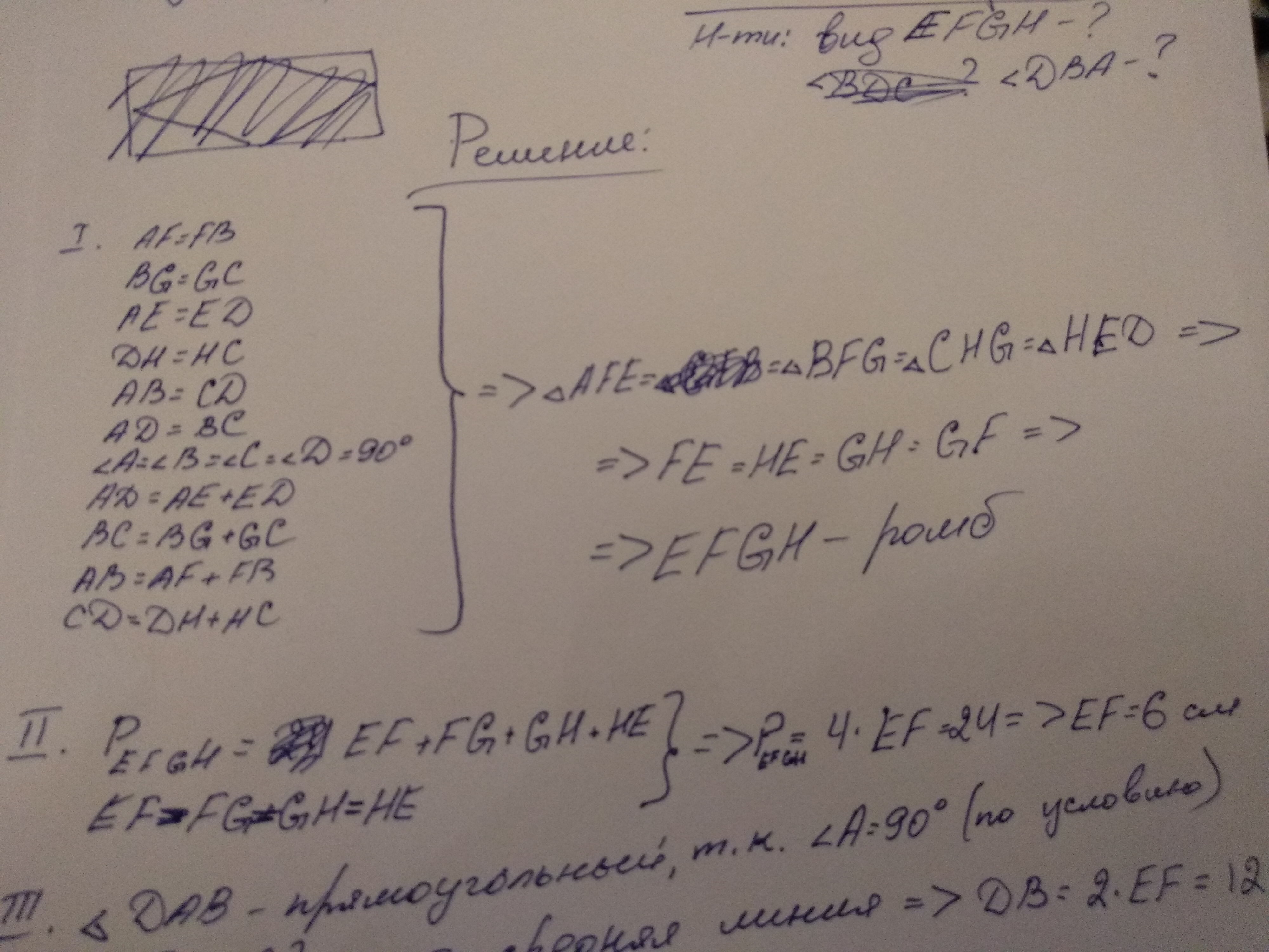 Меньшая сторона прямоугольника равна 6 см, а периметр четырехугольника, вершины которого – середины сторон данного прямоугольника, равен 24 см. Определите вид образованного четырехугольника и найдите угол, который образует диагональ прямоугольника с большей стороной.