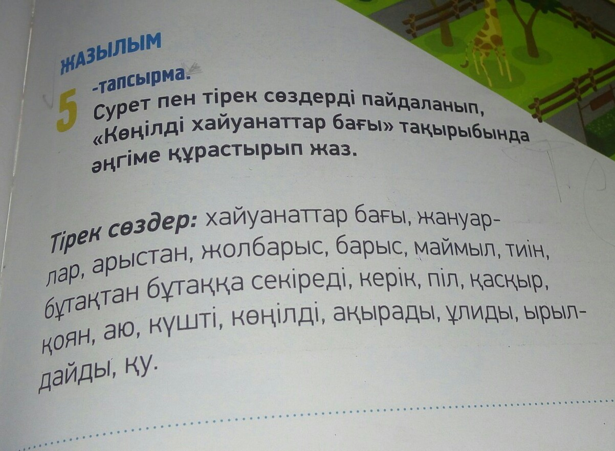 Әсел хайуанаттар бағына барды.Онда әр түрлі жануарлар болды. Онда арыстан, жолбарыс, барыс, маймыл, керік ,піл,қасқыр, қоян, аю, тиін болды. Арыстан ақырды. Жолбарыс ырылдады. Қасқыр ұлыды .Аю күшті .Ал маймыл қу болды.