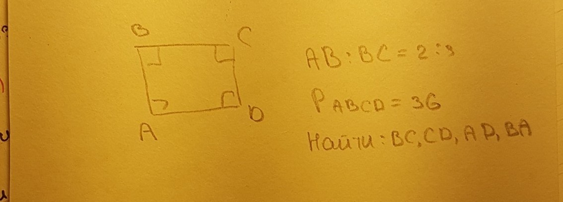 если АВ:ВС=2:3, то АВ=2х, а ВС=3х, тогда СД=АВ=2х, а АД=ВС=3х