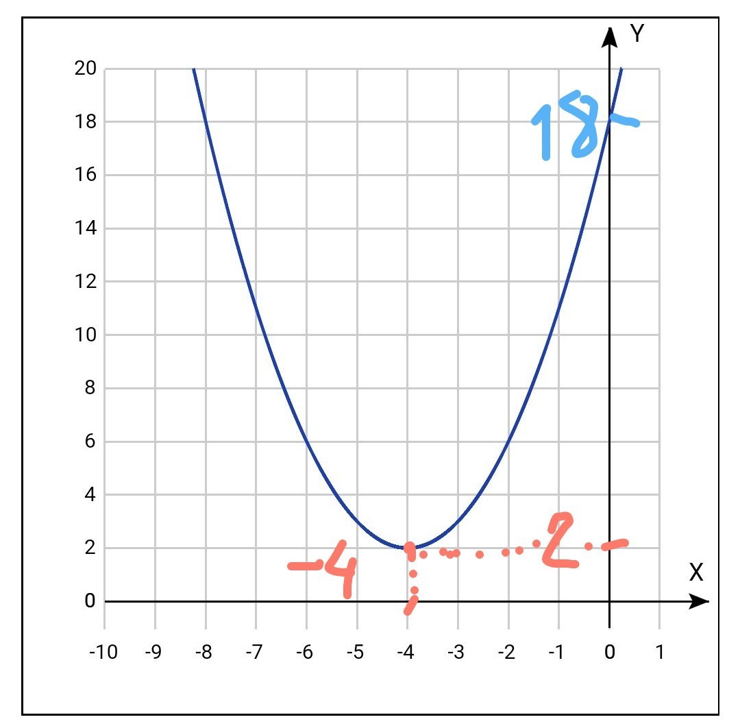 функция получается параллельным сдвигом функции у=х² вдоль оси ох на 4 единицы влево и на 2 единицы вверх вдоль ОУ