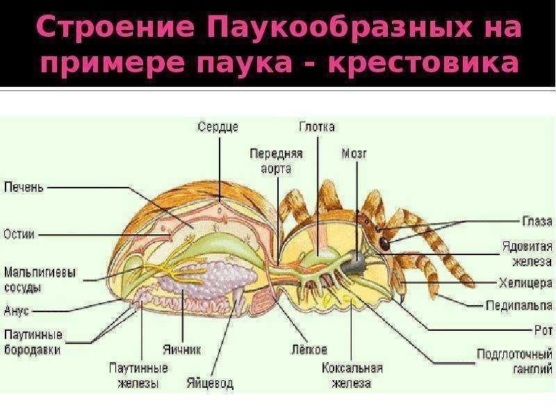 1 - простые глазки, 2 - ядовитая железа, 3 - хелицера, 4 - мозг,