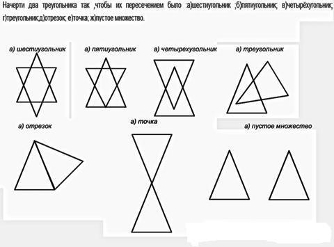 начертить 2 триугольника так чтоб их пересечением были: а) шестиугольник; б) пятиугольник;в) чотырехугольник; г) треугольник;д) отрезок;е) точка;э) пустая множина