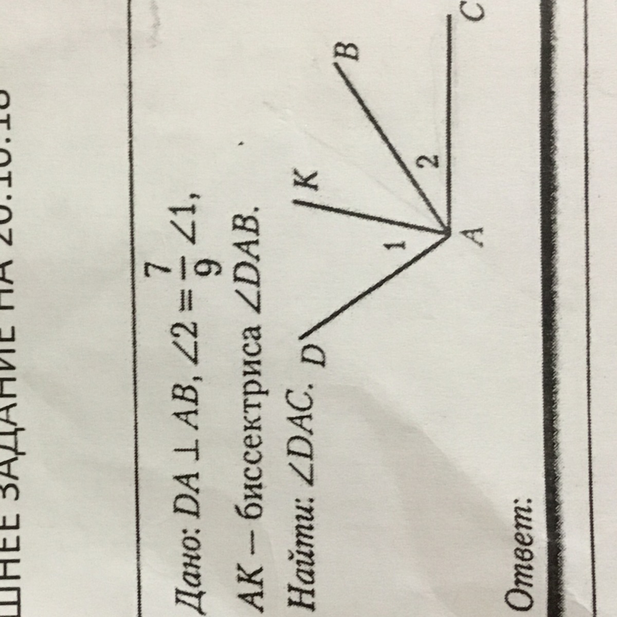 т. к. АК-биссектрисса, а угол DAB=90°, то угол DAK=углу KAB=90:2=45°. следовательно угол 2=угол 1(DAK)*7/9=45*7/9= 35°, угол DAC=угол DAK+угол KAB+ угол BAC= 45+45+35=125°