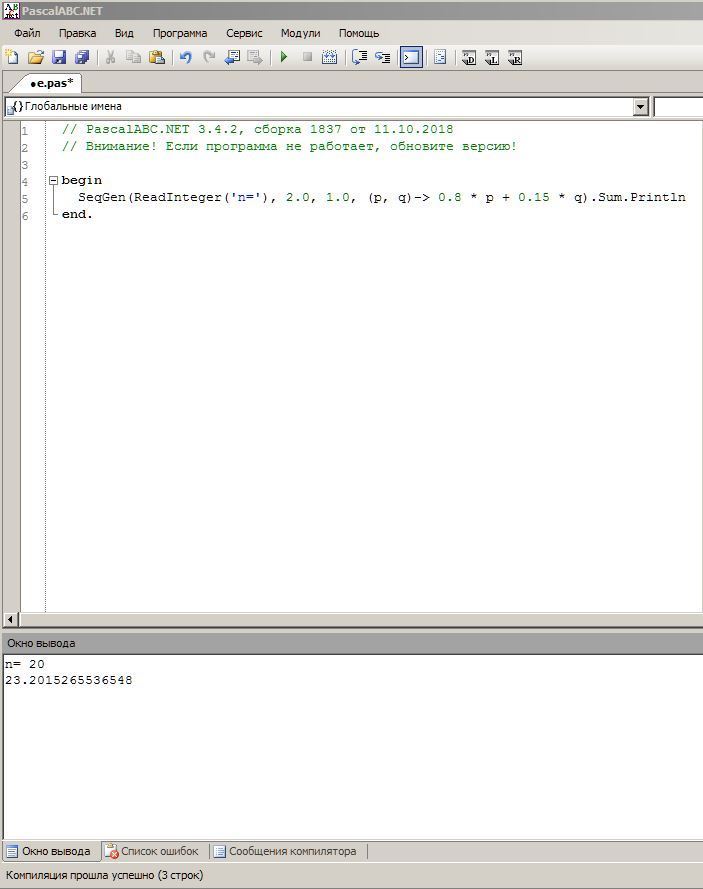 SeqGen(ReadInteger('n='), 2.0, 1.0, (p, q)-> 0.8 * p + 0.15 * q).Sum.Println