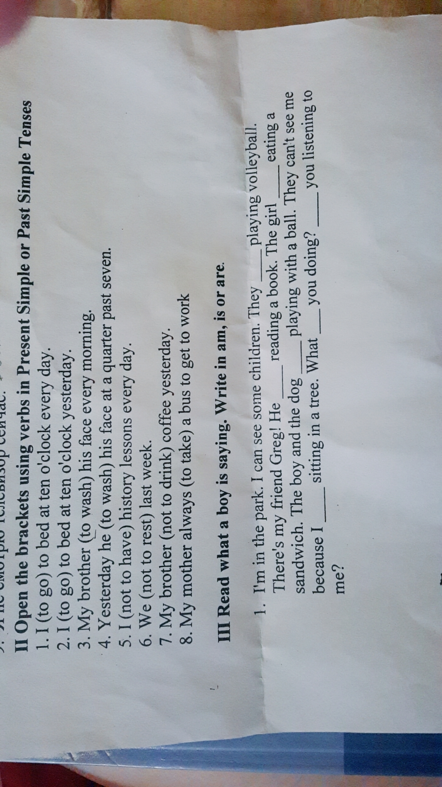 Go, went, washes, washed, don't have, didn't rest, didn't drink, takes.