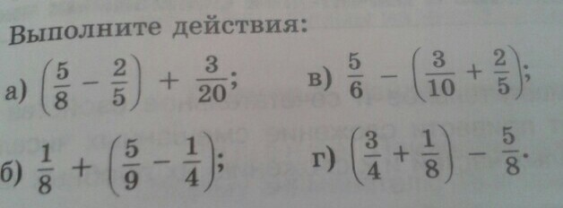 а)(5/8-2/5)+3/20=(25/40-16/40)+6/40=9/40+6/40=15/40 или 3/8