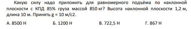 F=m*g*h/L*кпд=850*10*1,2/10*0,85=1200 H