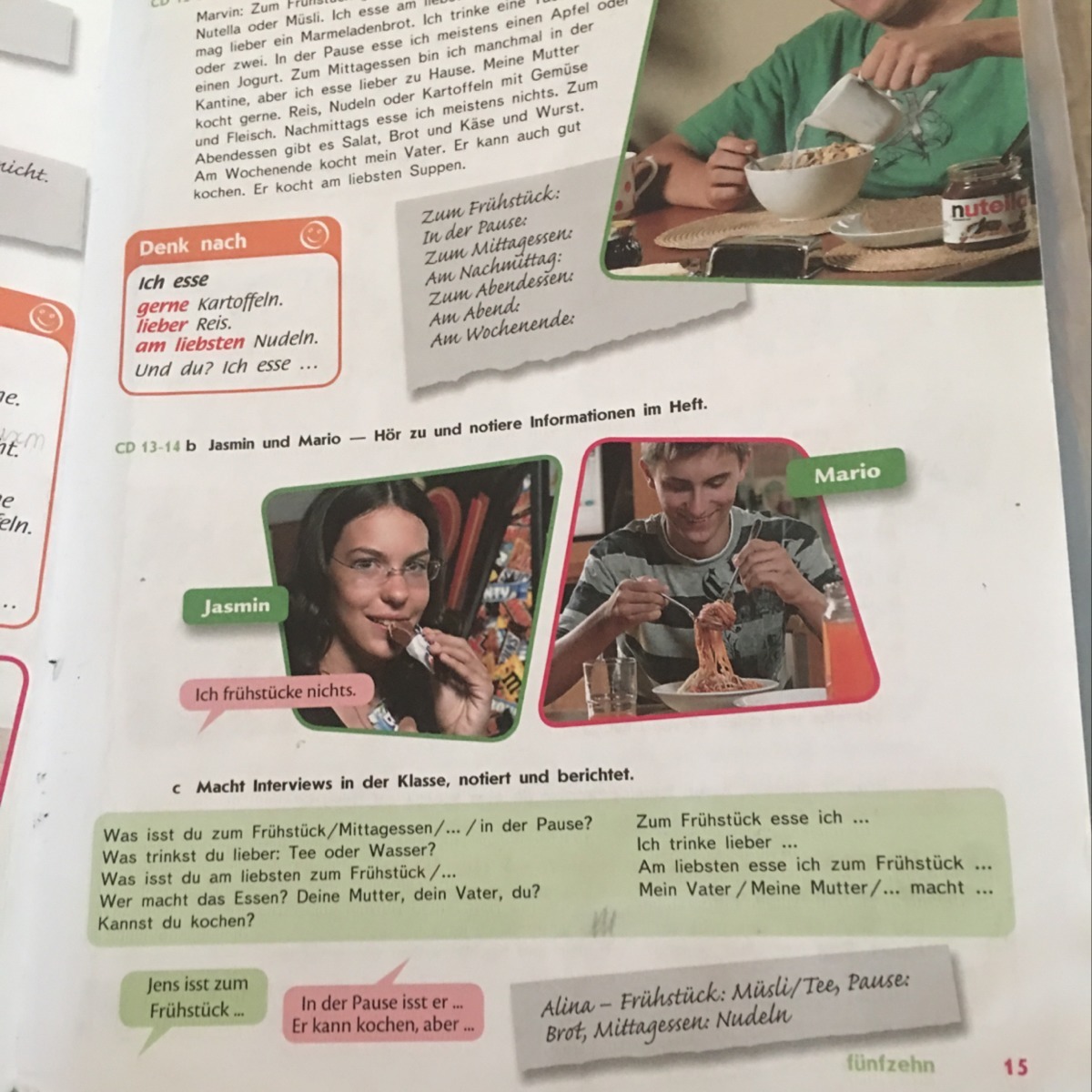 Was isst du in der Pause? In der Pause esse ich immer Apfel und Schokolade. Was trinkest du lieber: Wasser oder Cola/Tee? Ich trinke lieber Wasser. Was isst du liebsten zum Frühstück? Am liebsten esse ich zum Frühstück Müsli. Wer macht das Essen? Deine Mutter, dein Vater, du? Ich mache das Essen. Kannst du kochen? Natürlich!