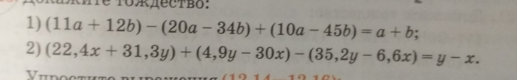 1). 11a+12b-20a+34b+10a-45b=a+b. левая часть равна правой. тождество доказано. (11a+10a-20a=a, 12b+34b-45b=b). 2). 22,4x+31,3y+4,9y-30x-35,2y+6,6x=y-x. левая часть равна правой. тождество доказано. ( 31,3y+4,9y-35,2y=y, 22,4x-30x+6,6x= -x).