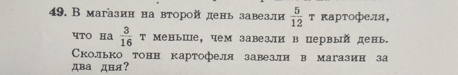 5/12 + 3/16 = 20/48 + 9/48 = 29/48 ( т ) завезли в 1-ый день