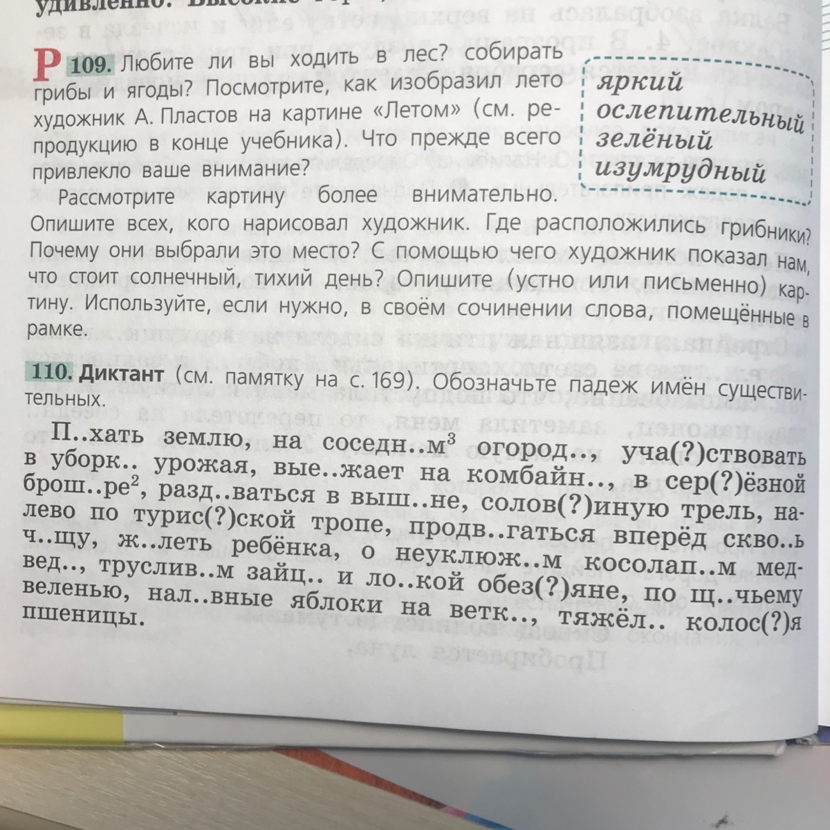 пахать землю, на соседнем огороде,участвовать в уборке урожая, выезжает на комбайне,в серьёзной брошюре, раздаваться в вышине, соловьиную трель, налево по туристской тропе, продвигаться вперед сквозь чащу, жалеть ребенка, о неуклюжем косолапом медведе, трусливом зайце и ловкой обезьяне, по щучьему веленью, наливные яблоки на ветке,тяжелые колосья пшеницы.