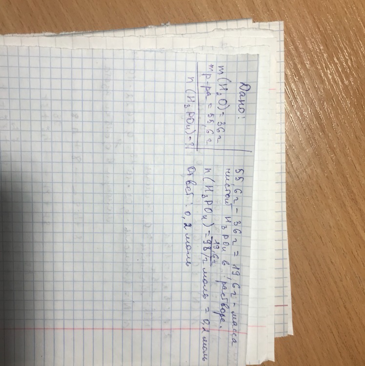 Найдите химическое количество фосфорной кислоты, которую нужно добавить к воде массой 36 г для получения смеси (раствора) массой 55,6 г.