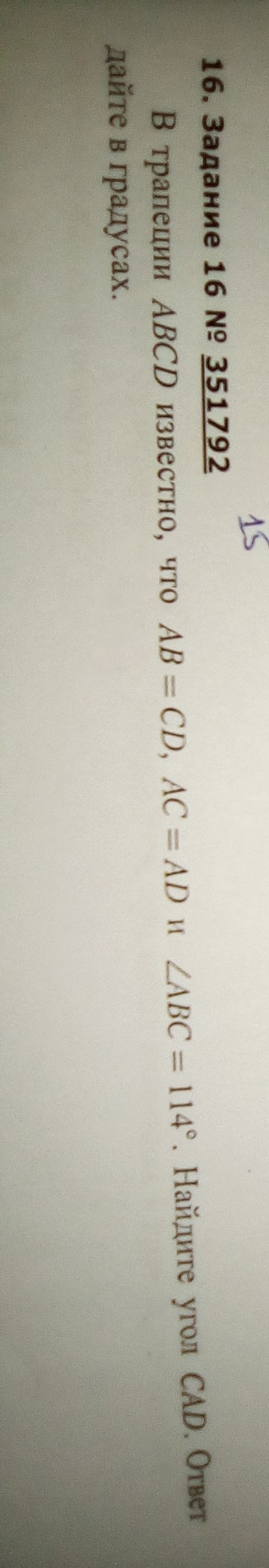 Заметим тот факт, что трапеция равнобокая. Значит её противоположныне углы в сумме должны быть 180°. Так как ∠ABC=114°