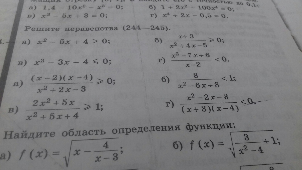 1); ; x^2-3x-4leq 0; ; ,; ; ; x_1=-1; ,; x_2=4; ; (teor.; Vieta)\\(x+1)(x-4)leq 0\\+++[-1, ]---[, 4, ]+++\\xin [-1,4, ]\\2); ; frac{x^2-7x+6}{x-2}<0\\x^2-7x+6=0; ,; ; x_1=1; ,; x_2=6; ; (teor.; Vieta)\\frac{(x-1)(x-6)}{x-2}<0\\---(1)+++(2)---(6)+++\\xin (-infty ,1)cup (2,6)
