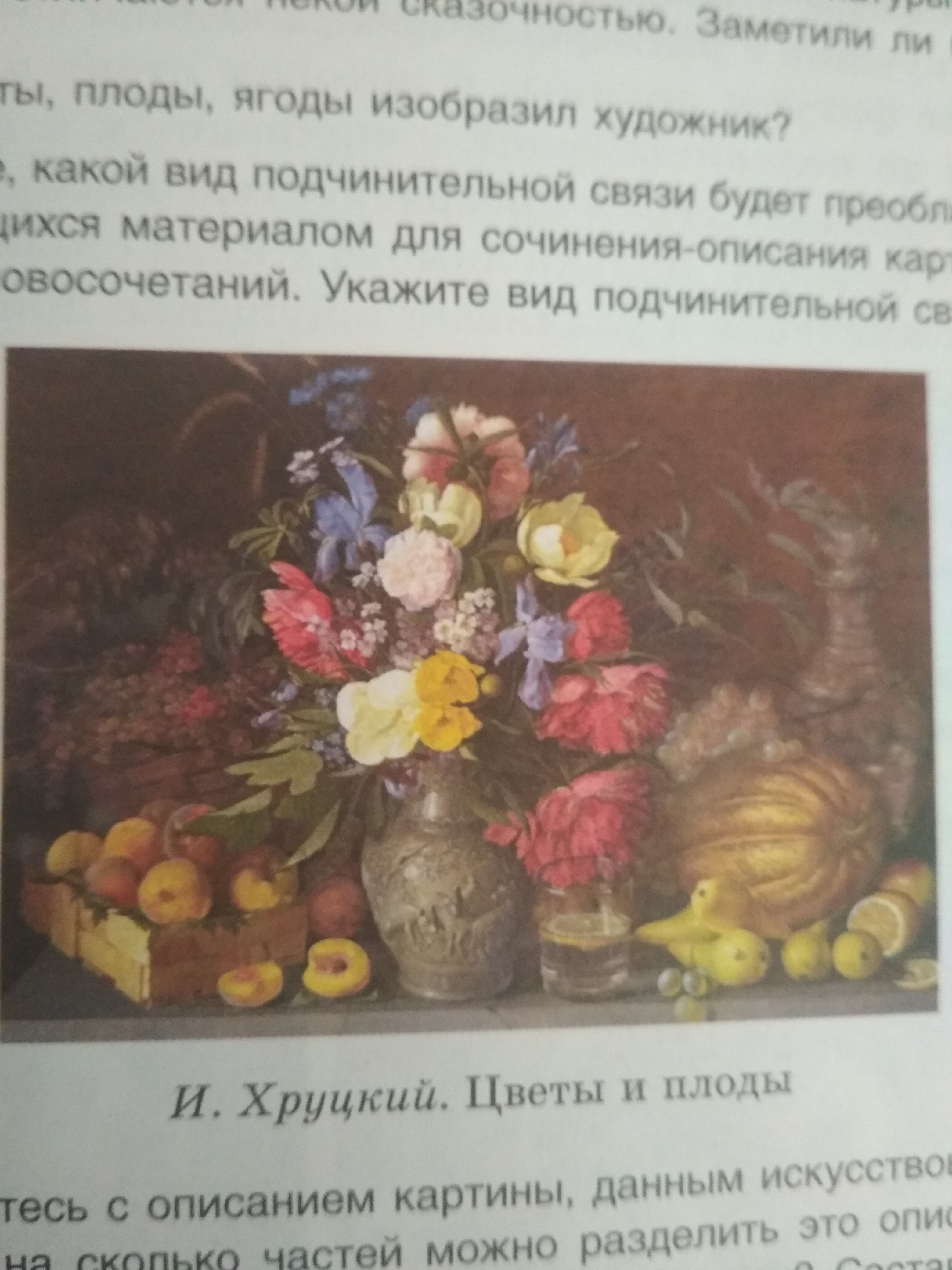 На картине И.Хруцкого "Цветы и плоды"мне в глаза бросаются пышные цветы,красивых цветов темных оттенков они внутри овальной вазы напоминающую исторический стиль.В левой стороне находятся фрукты в ящиках они также небрежно стоят на краю ящика и вазы.В ящиках персик и виноград. В правой стороне лежит тыква в сторону к вазе.Перед тыквой лежат груши,апельсины один из которых разрезан.На тыквенный также лежат винограды.А также сзади всего этого стоит если не ошибаюсь стоит кувшин.А перед вазой в прозрачном стакане имеется коньяк или что-то связанное с алкоголем т.к. на сок,компот,чай это никак не похоже