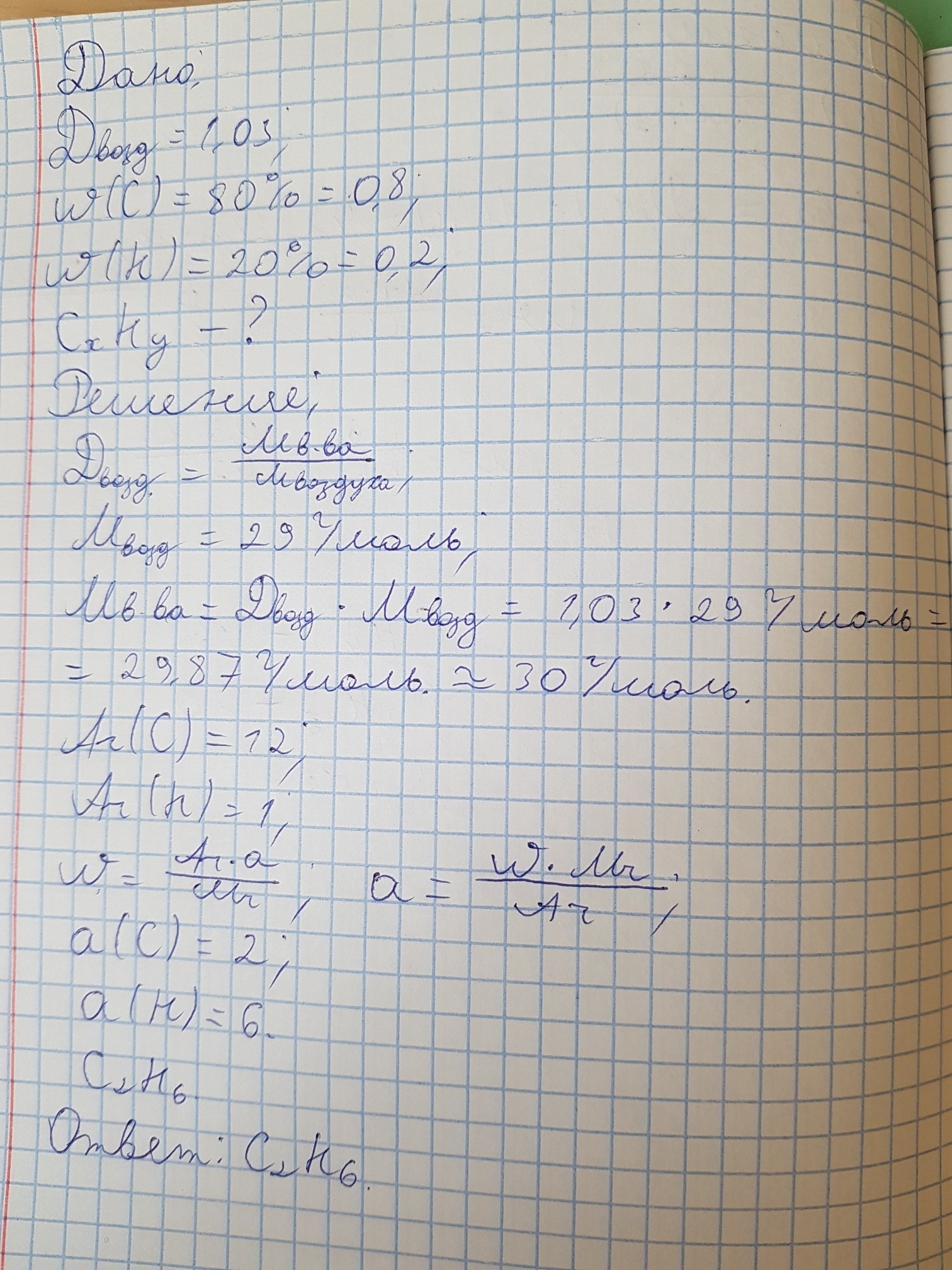 Определите молекулярную формулу углеводорода который содержит 80% карбона и 20% гидрогена (по массе) относительная густота этого углеводорода по воздуху равна 1,03. можно с дано и решением)