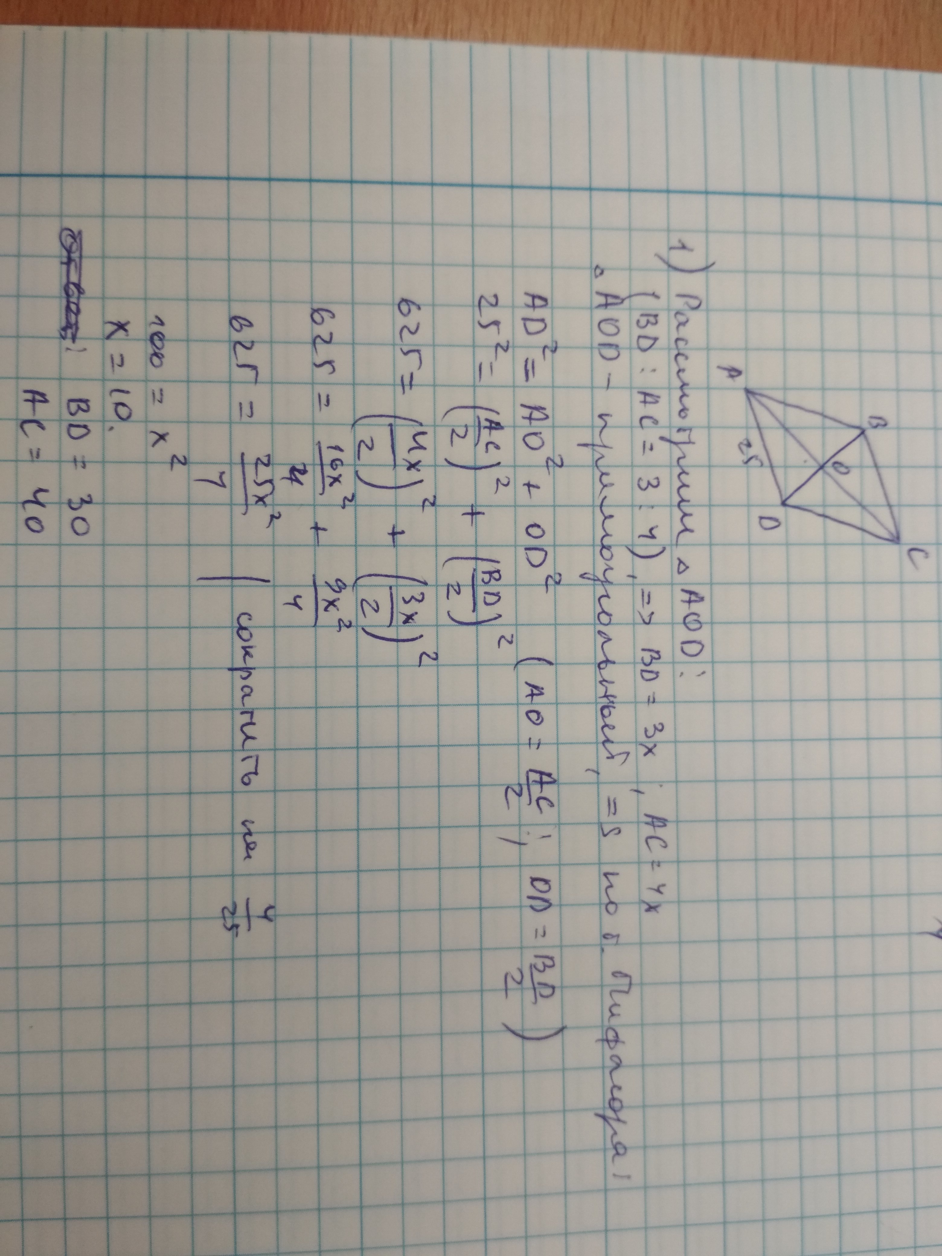 чему равна сумма даиагоналей ромба, если они пропорциональны числам 3:4, а сторона ромба равна 25 см?