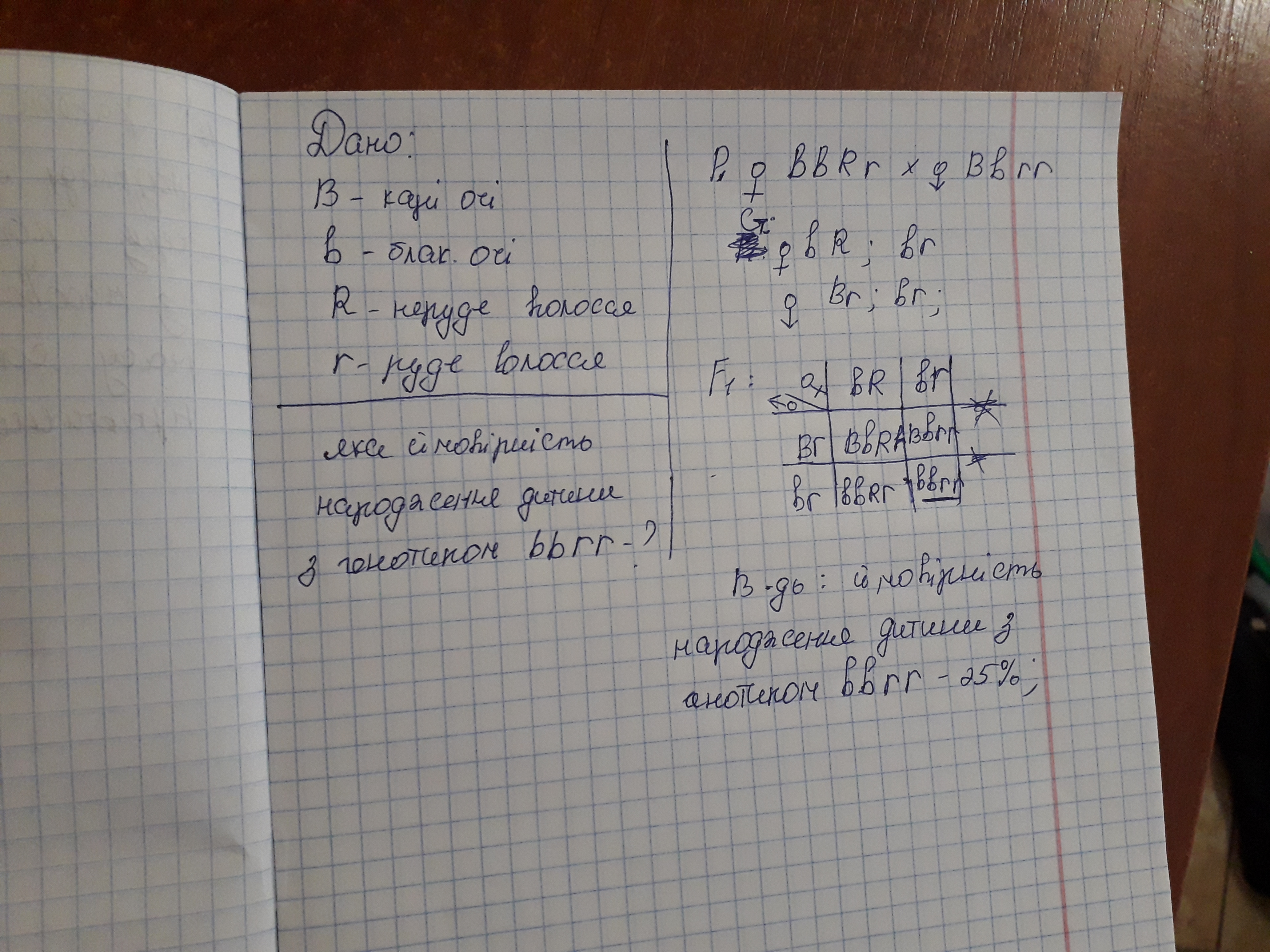 Відомо що ген карих очей В домінує над геном блакитних очей b. Рудий колір волосся r рецесивний стосовно гена R нерудого волосся. Чоловік з генотипом Bbrr, одружився з жінокою яка має генотип bbRr. Яка ймовірність народження дитини з генотипом дитини bbrr?