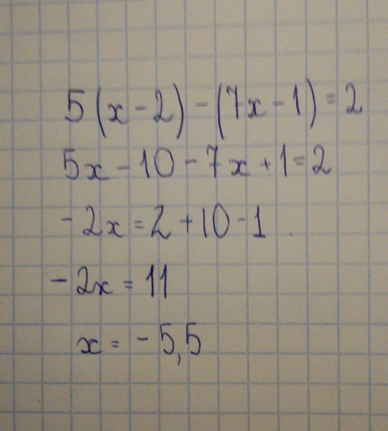 5х-10-7х+1-2=0 (если раскрыть скобки и перенести всё в одну сторону).