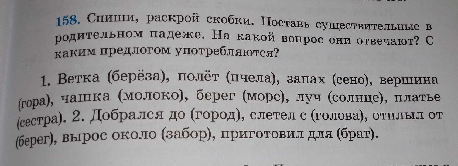 ветка березы,полет пчелы,запах сена,вершина гор,чашка молока,берег моря,луч солнца,платье сестры,добрался до города,слетел с головы,отплыл от берега,вырос около забора,приготовил для брата