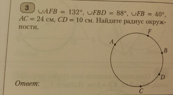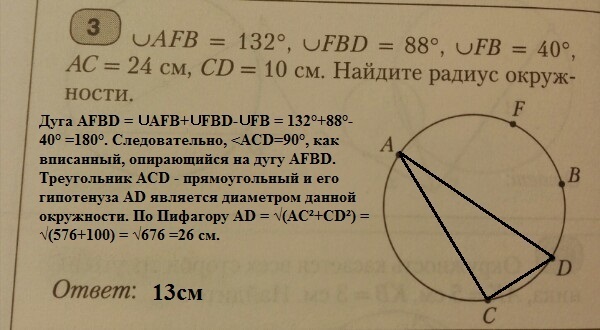 Дуга AFBD = ∪AFB+∪FBD-∪FB = 132°+88°-40° =180°. Следовательно, <ACD=90°, как вписанный, опирающийся на дугу AFBD. Треугольник ACD - прямоугольный и его гипотенуза AD является диаметром данной окружности. По Пифагору AD = √(AC²+CD²) = √(576+100) = √676 =26 cм.