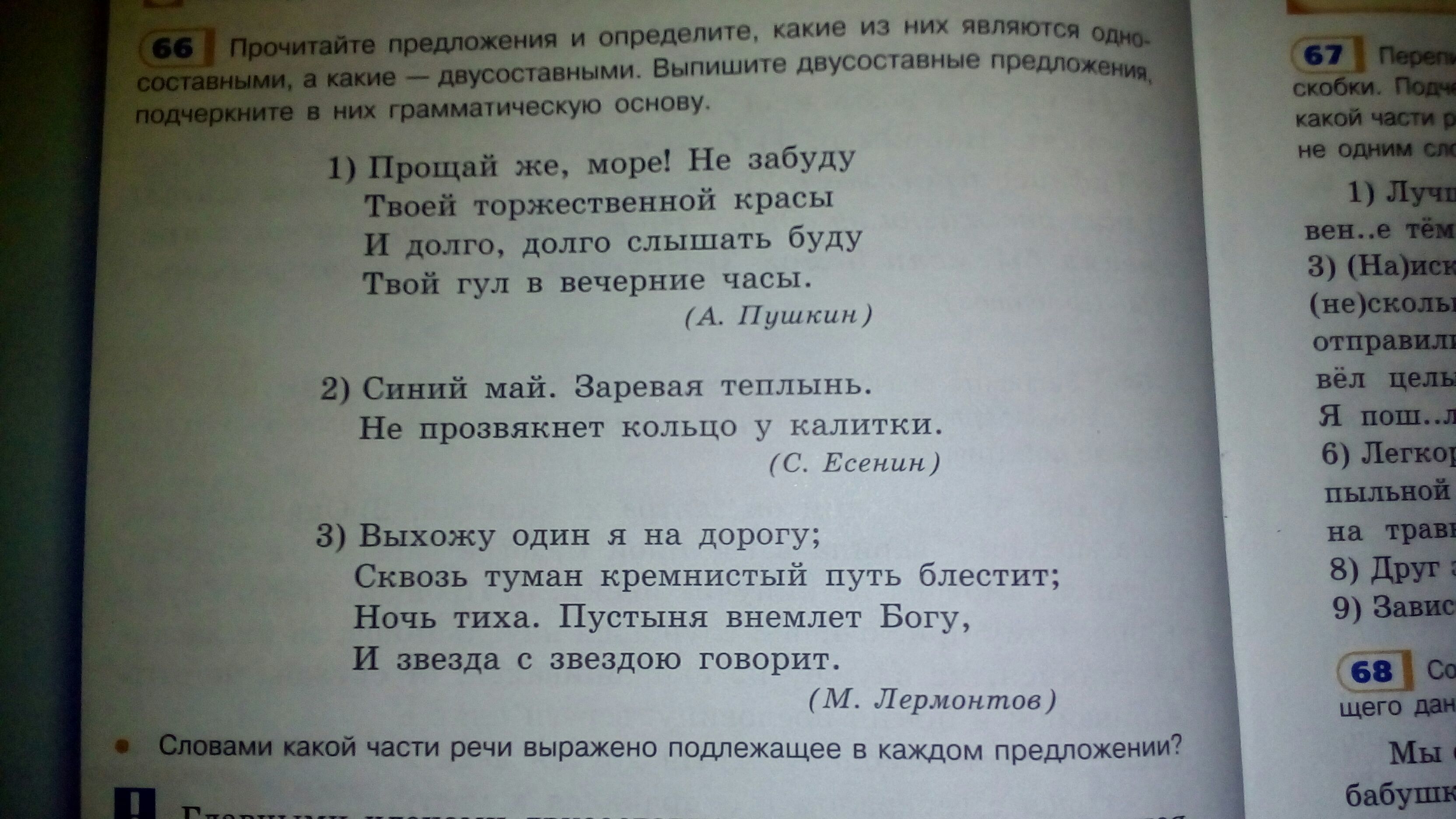 2 и 3 двусоставные.во 2-ом граммаматическая основа:не прозвякнет кольцо,а в 3-ем:выхожу я;путь блестит;ночь тиха;пустыня внемлет; звезда говорит.Местоимением и существительным выражено подлежащее. (Как подлежащее и сказанное подчеркивать понятно)