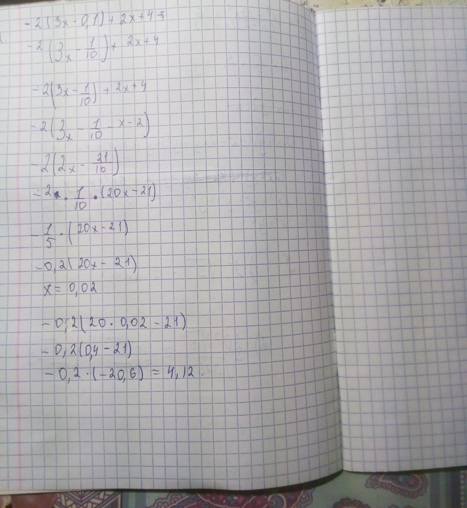 Упростите выражение -2(3x-0.1)+2x+4 и найдите его значение при x=-0.02
