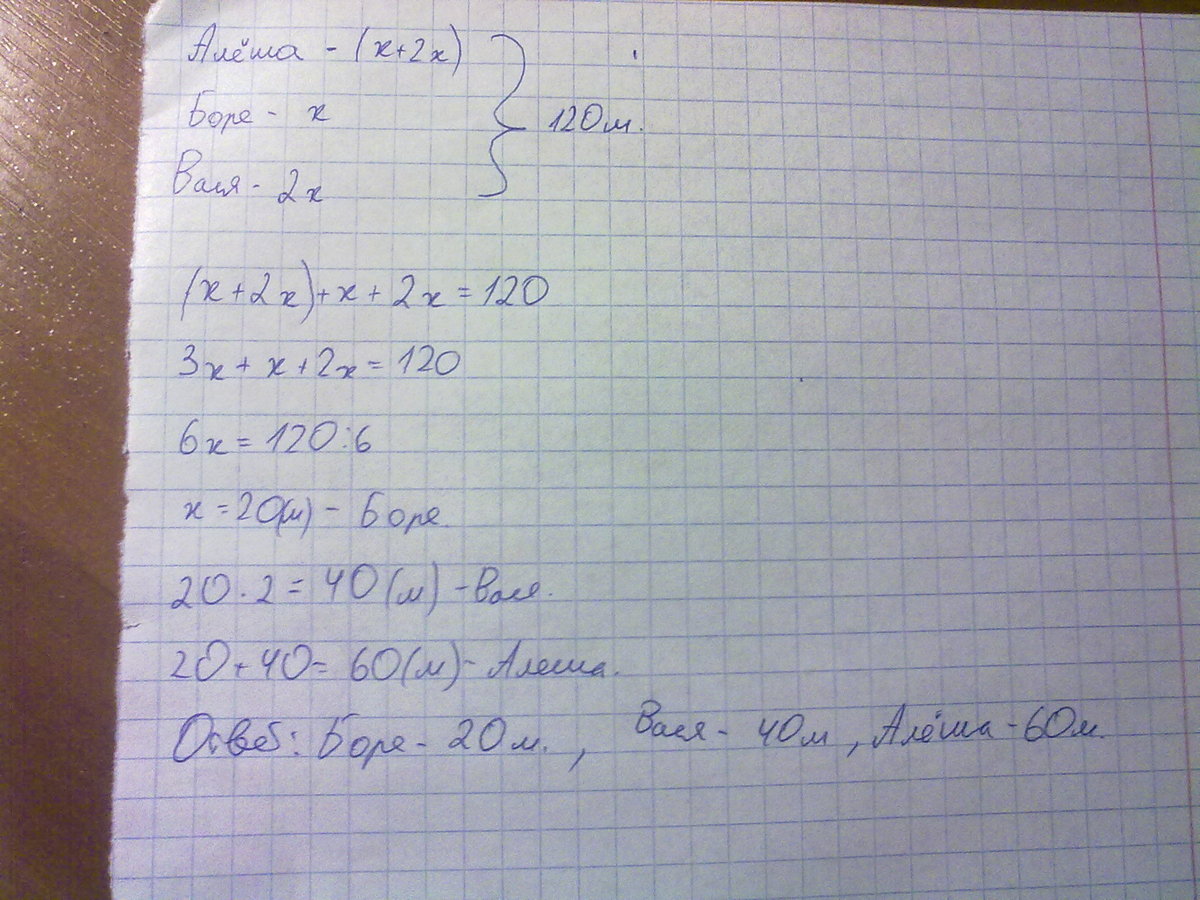 У Алеши , Бори и Васи вместе 120 марок. У Алеши марок столько, сколько у Бори и Васи вместе. сколько марок у алеши? решить задачу и как правильно ее записать?