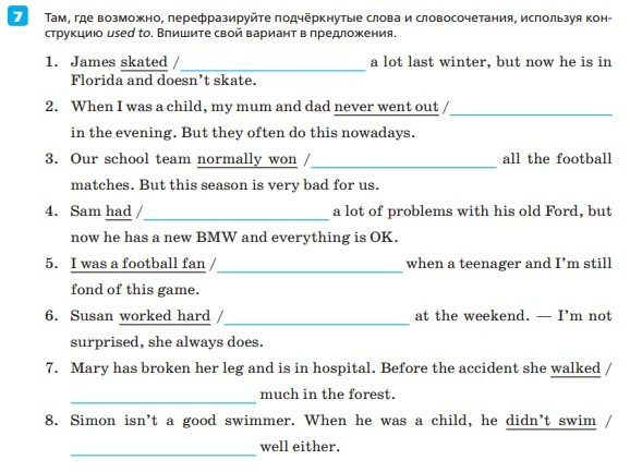 1 used to skate 2 didn’t use to go 3 used to win 4 used to have 5 без изменений 6 без изменений 7 used to walk 8 без изменений