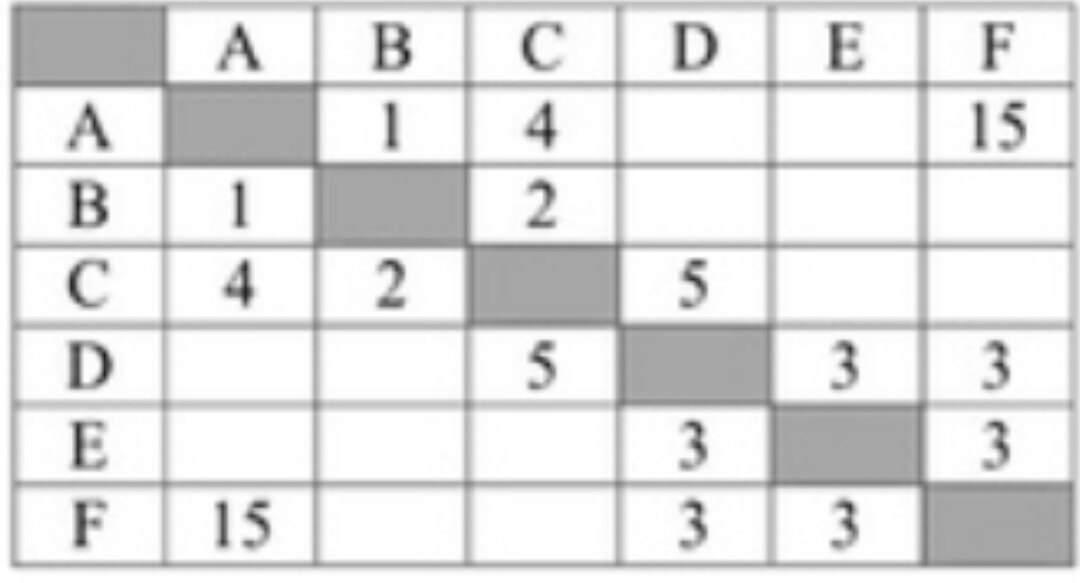 Между населенными пунктами A, B, C, D, E, F построены дороги, протяженность которых приведена в таблице. Отсутствие числа в таблице означает, что прямой дороги между пунктами нет.