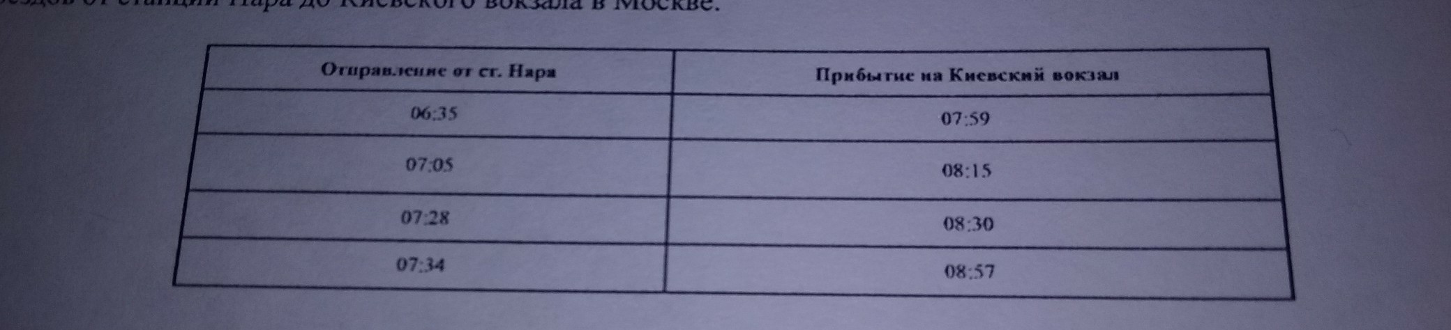 студент Петров выезжает из наро-фоминска в Москву на занятия в университет занятия начинаются в 9:00 таблице приведено расписание от станции Нара до Киевского вокзала в Москве