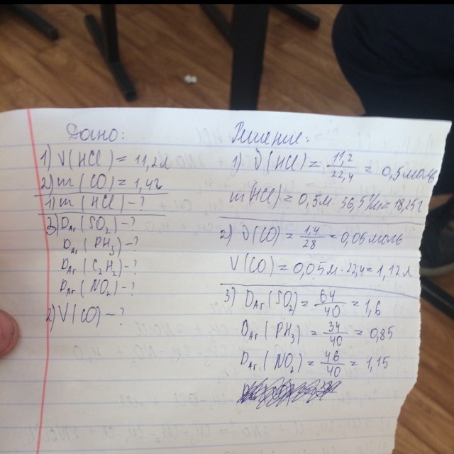 какая масса в граммах 11,2 л хлора водорода .какой объём занимает порция оксида углерода 2 массой 1,4 г . найти D по Ar (SO2) (PH3) (C2H2) (NO2) Срочно!!!!!!