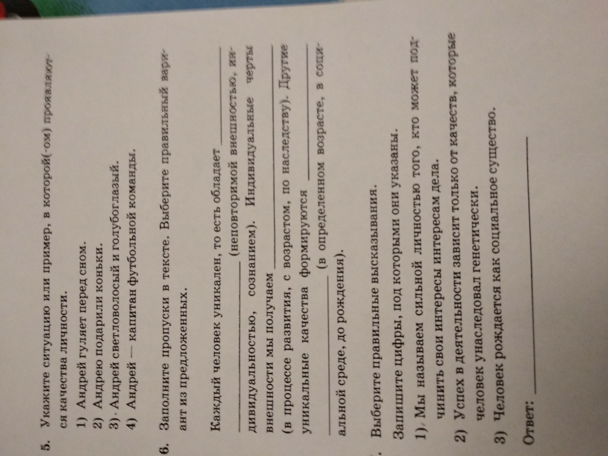 6. ..обладает индивидуальностью; ..мы получаем в процессе развития; ..формируются в социальной среде;