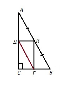 Через середину K гипотинузы AB прямоугольного треугольника ABC проведены прямые, параллельные его катетам. Одна из них пересекает катет AC в точке D, а другая- катет BC в точке E. Найдите отрезок DE, если AB=12 см