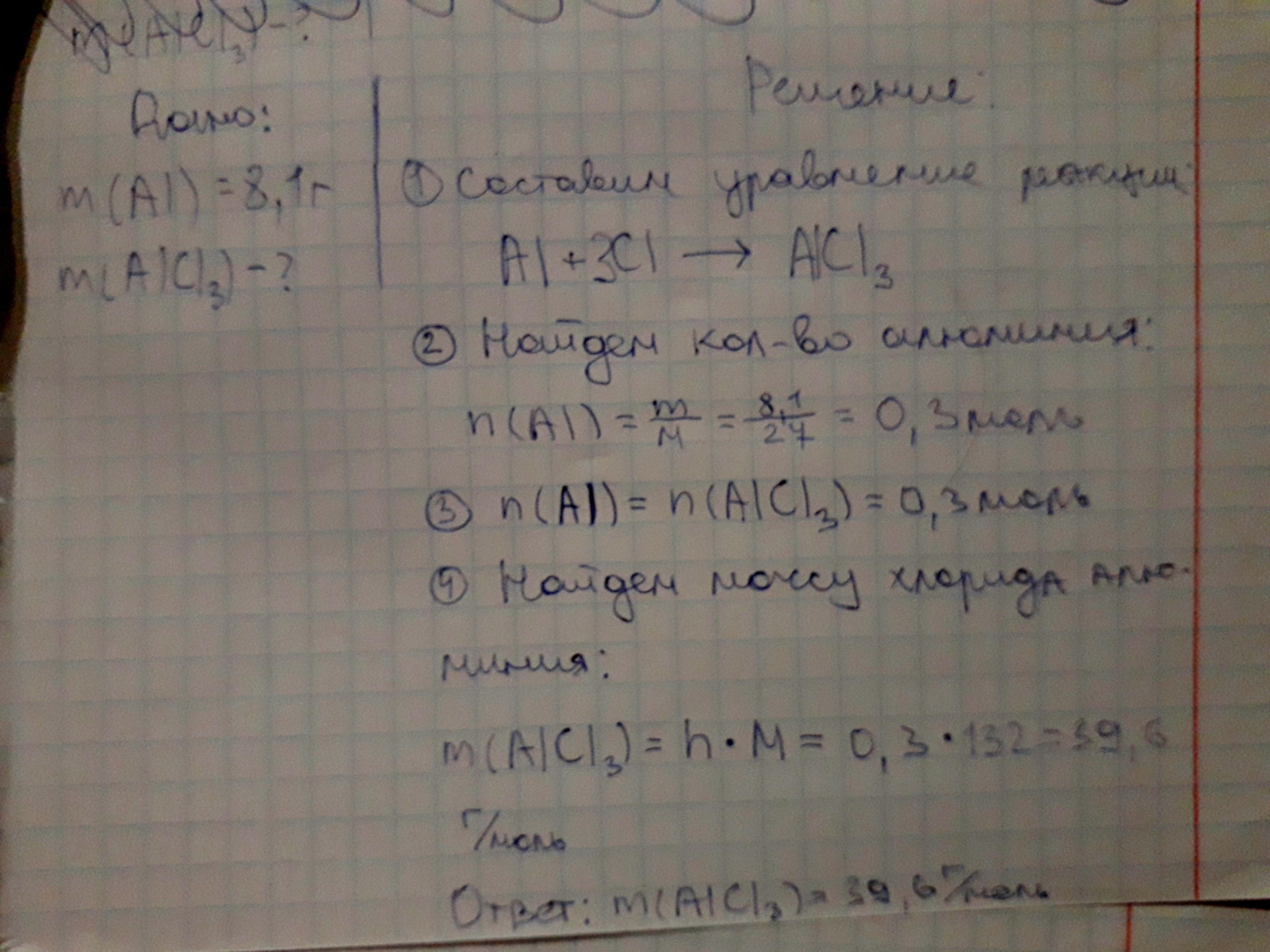 Определите массу Хлорида алюминия образующего при сжигании 8,1г, алюминия в хлоре. Решить как задачу и дать ответ с условием