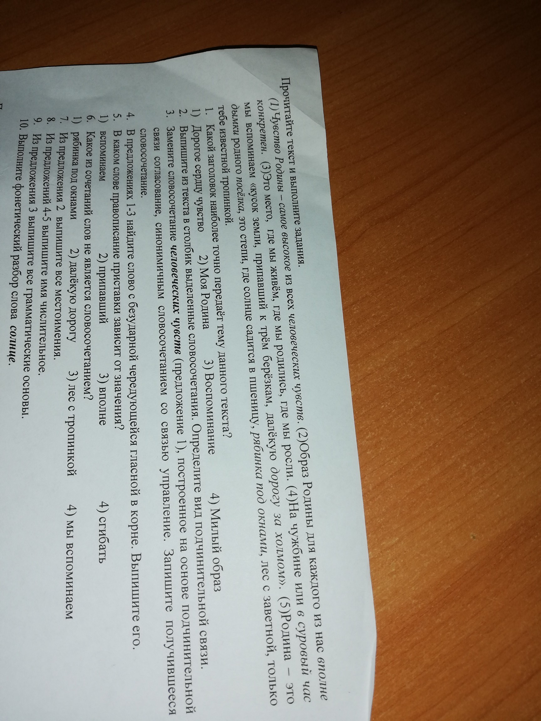 2.Чувство Родины(управление),человеческих чувств(согласование), вполне конкретен(примыкание),суровый час(согласование),дорогу за холмом(управление),дымки поселка(управление),рябинка под окнами(управление).