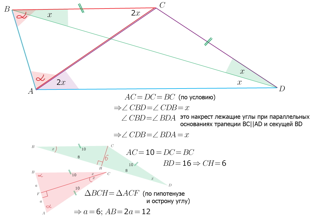 б) Найдите АВ, если известны длины диагоналей трапеции: BD=16 и АС=10