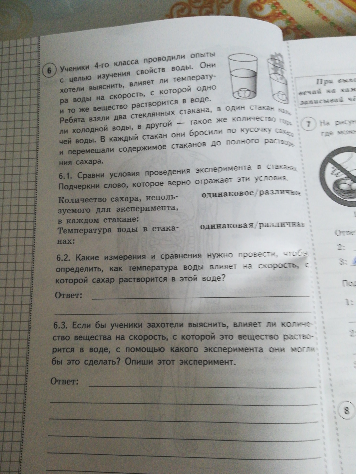 Ученики 4 класса проводили опыты с целью изучения свойств воды. Они хотели выяснить влияет ли количество воды на то, как быстро раствориться растворяется сахар в этой воде.Ребята взяли два стеклянных стакана, в один стакан налили немного,а в другой много воды одинаковой по температуре. в каждый стакан Они бросили по кусочку сахара и перемешали содержимое до полного растворения.