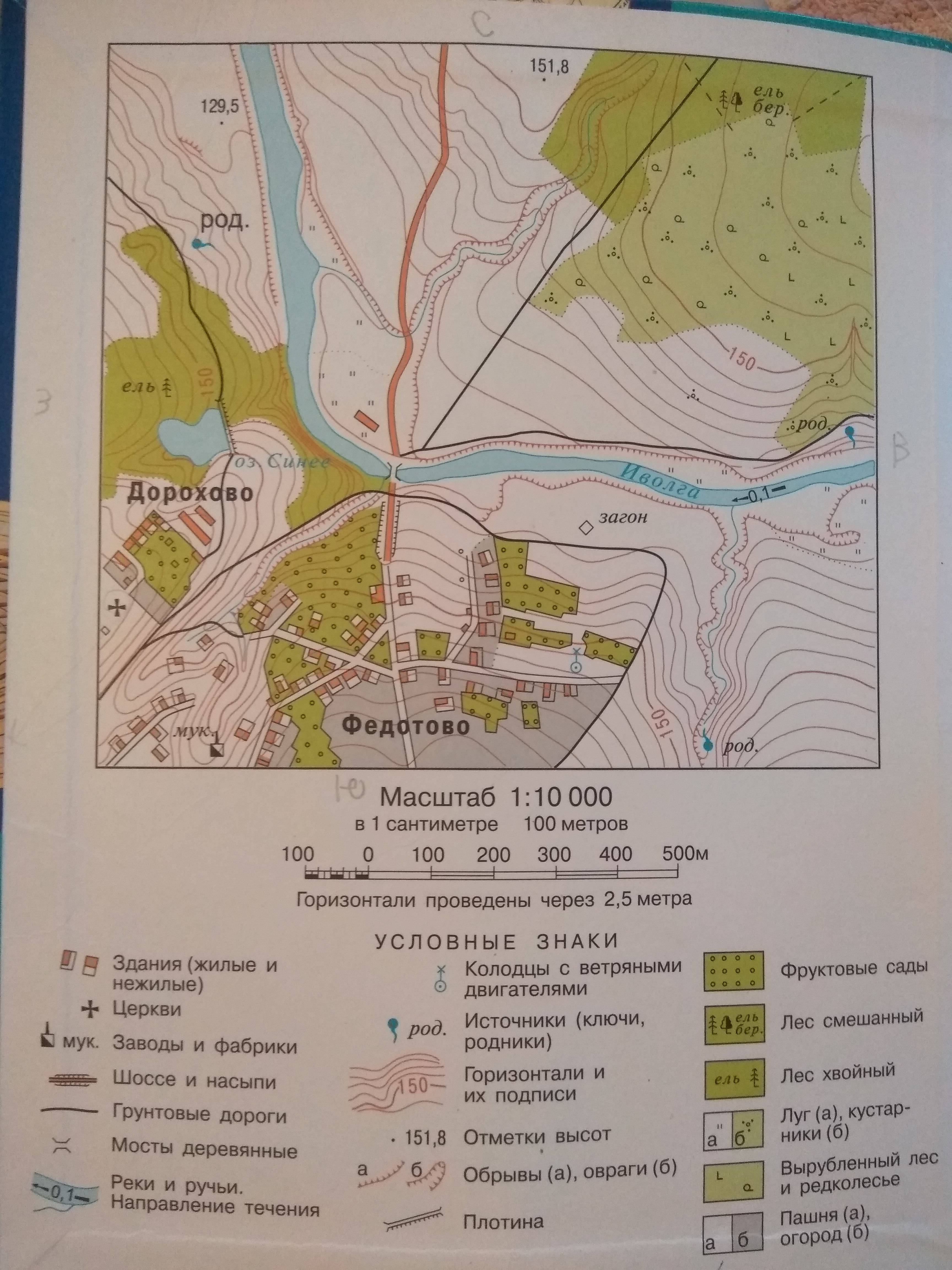 Помогите пожалуйста... С помощью топографического плана местности на форзаце в начале учебника определите расстояние между колодцем с ветряным двигателем и отметкой высоты 151,8.