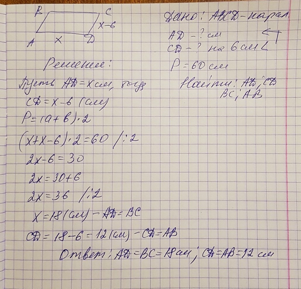 Периметр параллелограмма 60см. Одна из сторон на 6см меньше другой. Найдите длины сторон параллелограмма